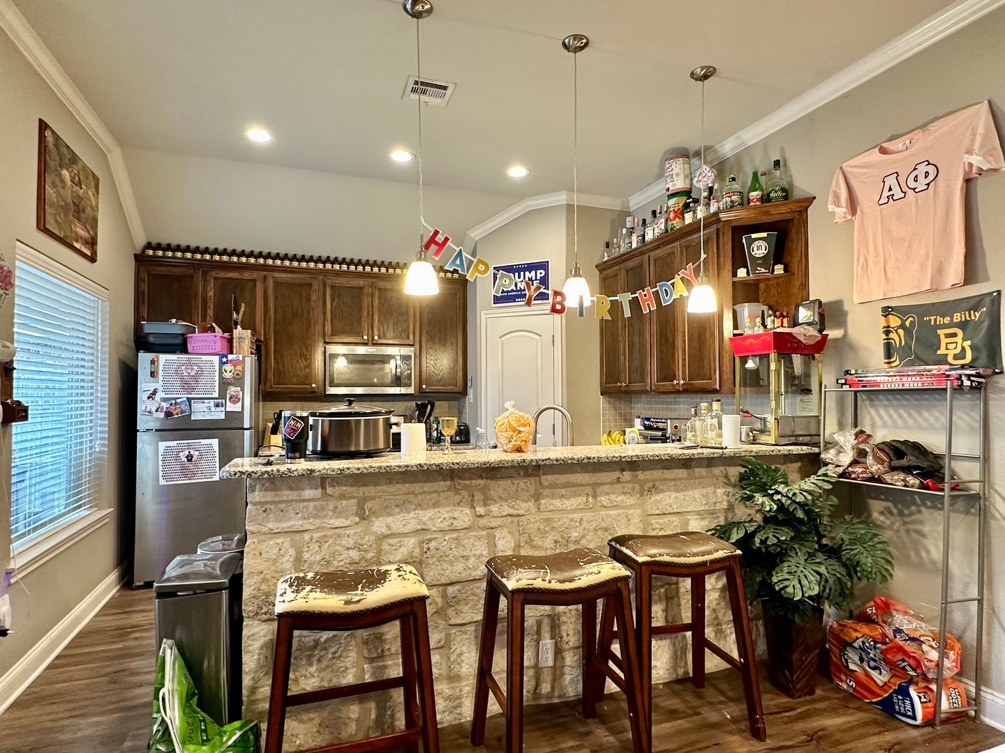 Inside, you’ll find granite countertops throughout, giving every room a polished and upscale touch. Luxury vinyl plank flooring adds style and durability while keeping maintenance simple. Each bedroom includes its own private bathroom, and there’s an additional half bath for guests. The open-concept kitchen and living area create an inviting space for studying, relaxing, or entertaining friends. Also included is in-unit laundry and ample parking for added convenience.